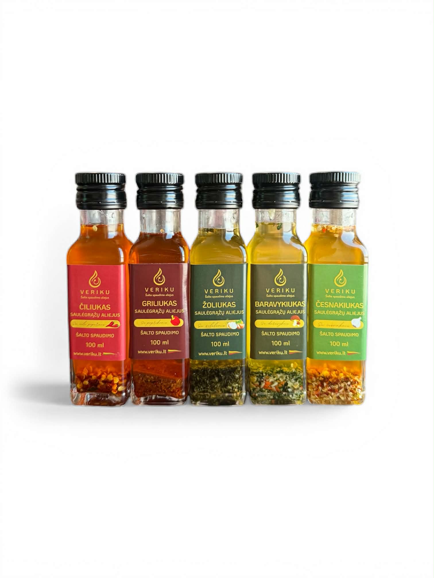 100ml „GRILIUKAS” Šalto spaudimo saulėgrąžų aliejus su saldžiomis paprikomis, svogūnais, druska, juodaisiais pipirais